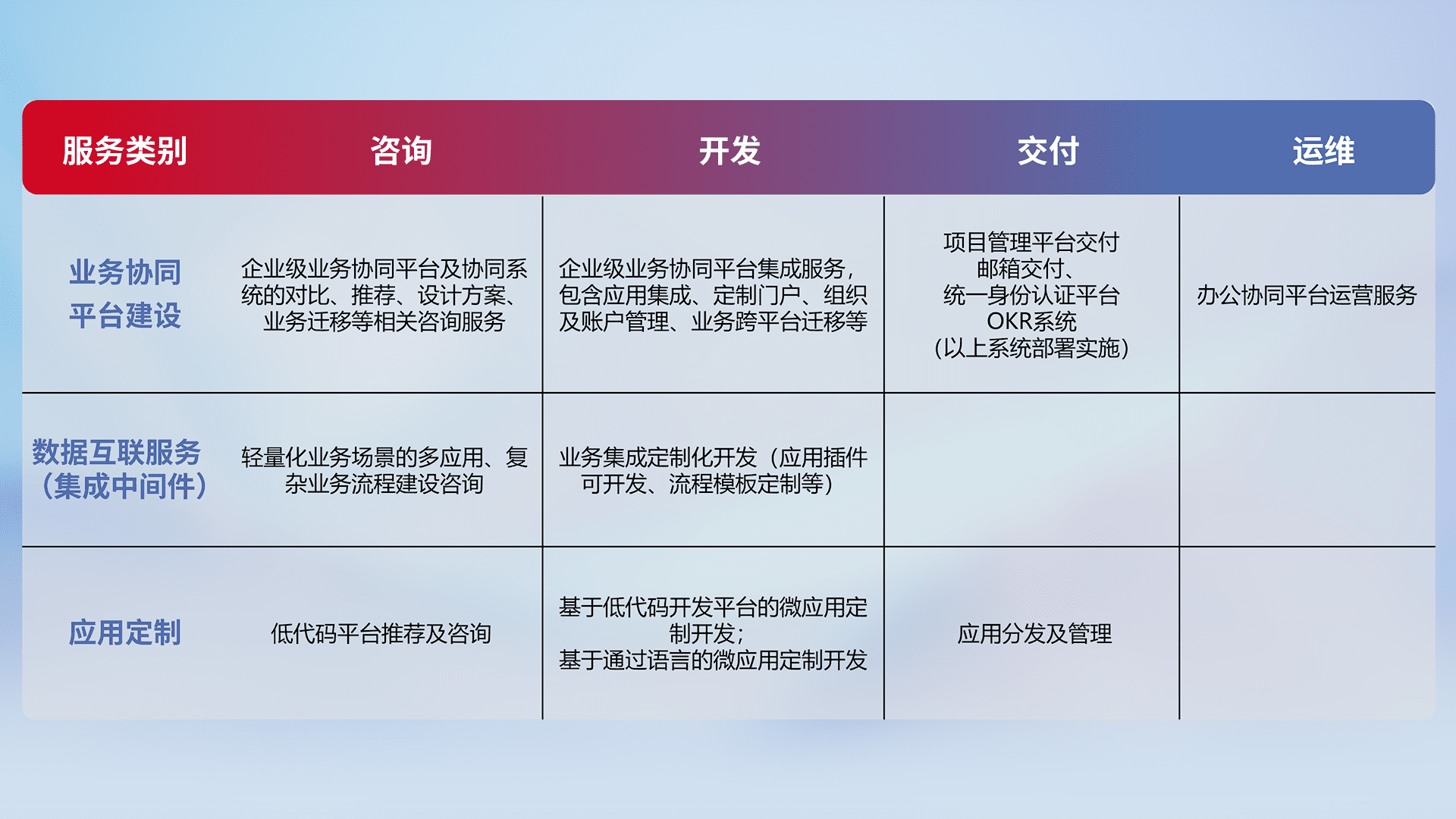 针对钉钉、、企微、、、、IDaas等平台级产品提供产品的规划、、、方案、、、交付、、、、定制化开发等服务,,,,实现如统一协同办公、、、、智能客户服务、、、、混合会议管理、、智能数据查询、、、、等业务场景,,,,实现数字化转型。。。