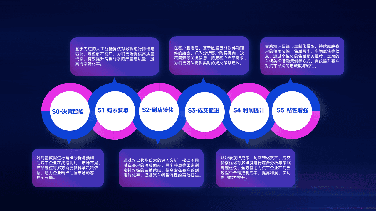 基于销售转化漏斗的薄弱环节,,,为客户提供数据+模型+运营的智能应用,,,实现销售业绩的提升;推动线索管理全链路的精细化管理和运营。。。